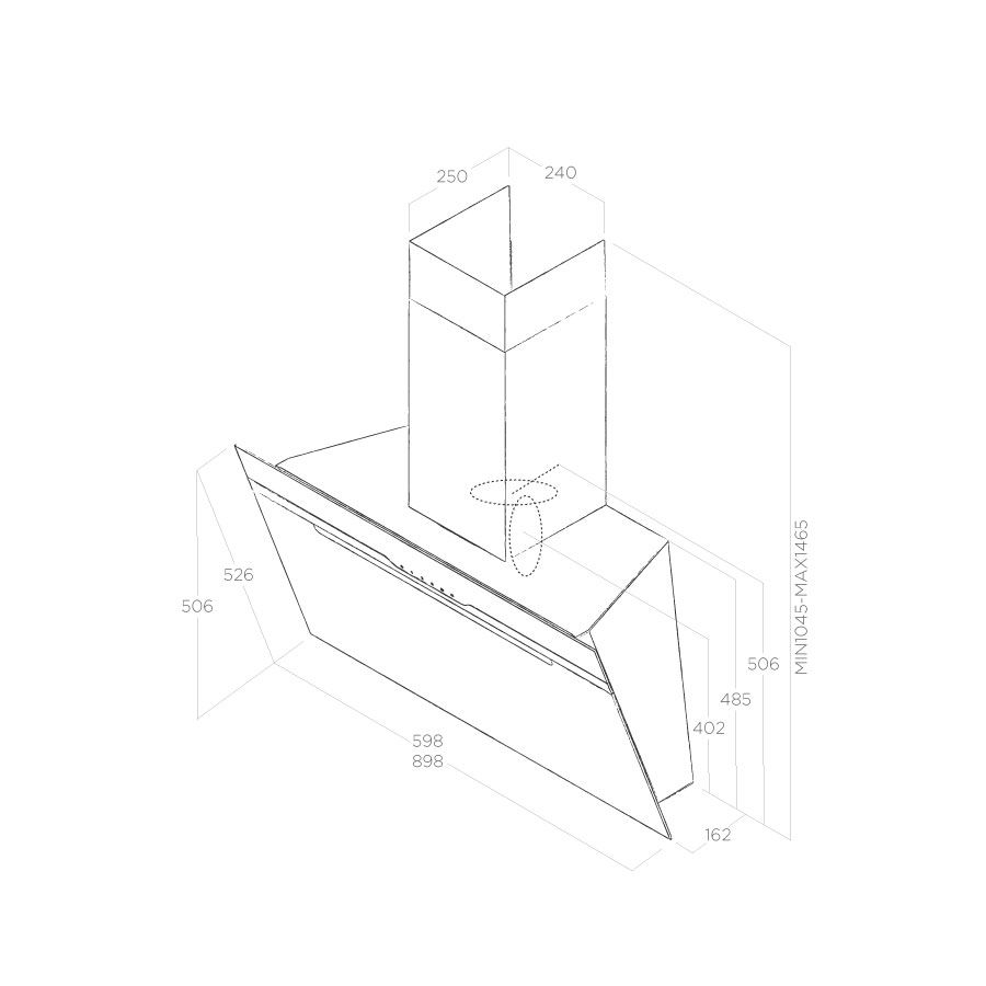 Функция забора воздуха обеспечивается при подключении вытяжки непосредственно к вентялиционному каналу в стене, избегая использования декоративного короба и сохраняя оригинальную эстетику изделия.