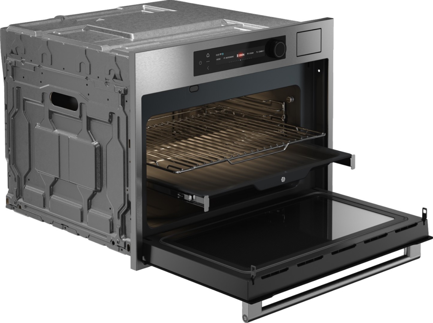 - Комплектация: 1 х универсальный противень, 1 х противень из нержавеющей стали с перфорацией, 1 х противень из нержавеющей стали без перфорации, 1 х решетка, 1 х стеклянный противень, 1 х термозонд
