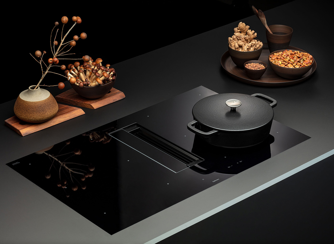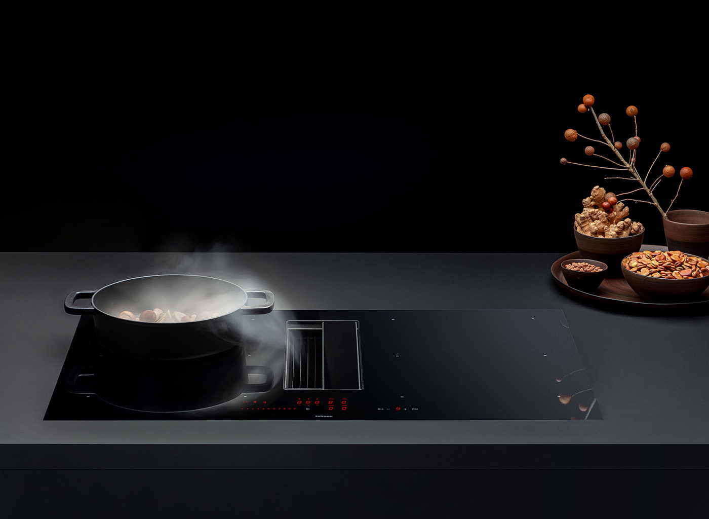 Особенности модели индукционная варочная панель с вытяжкой для режима РЕЦИРКУЛЯЦИИ, восстановление настроек варочной панели в случае случайного выключения, функция поддержания тепла: максимальная температура 70°, 9 уровней приготовления + функция Power (Over Boost), автоматический режим (скорость вытяжки автоматически регулируется в зависимости от мощности приготовления), емкость для сбора жидкости, возможность установки в один уровень со столешницей.