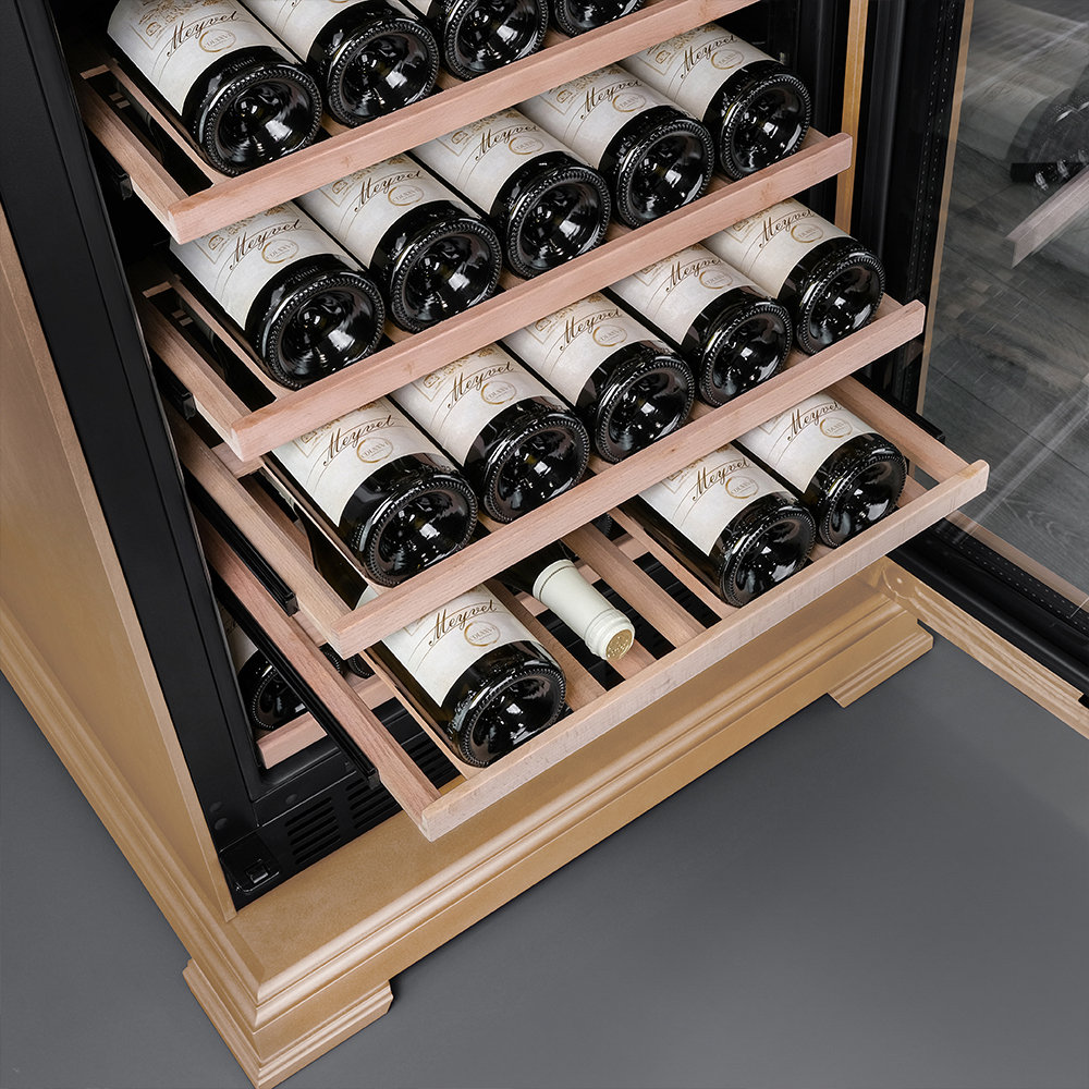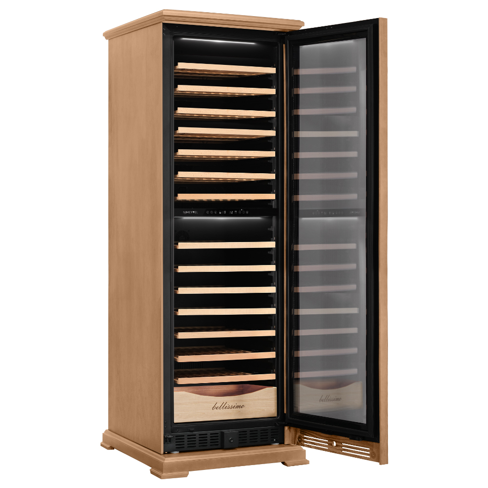 Винный шкаф предназначен для профессионального и длительного хранения различных сортов вин (до 174 бутылок типа Бордо). Он так же оснащен дверью с защитой от ультрафиолетовых лучей и поддерживает влажность в диапазоне 60-80%, как в настоящем винном погребе. Стальной корпус обшит натуральным буком, который выдерживает большие нагрузки и обладает красивой текстурой.