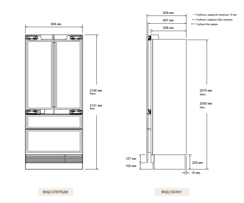 - Общая глубина: 629 мм